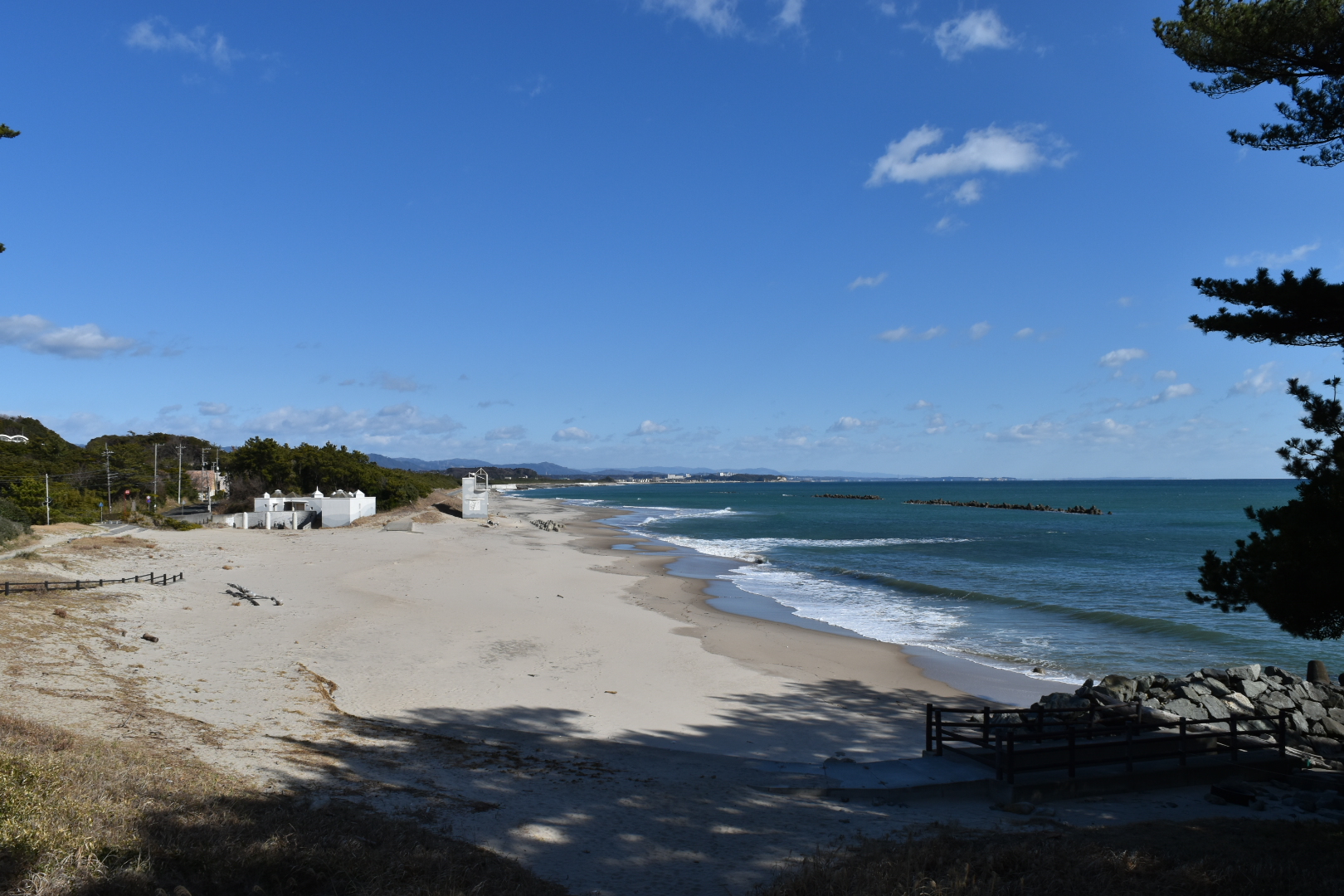 この海岸は『日本の白砂青松百選』に選ばれた美しい景観が特徴で、透明度の高い海と白い砂浜が広がっています。