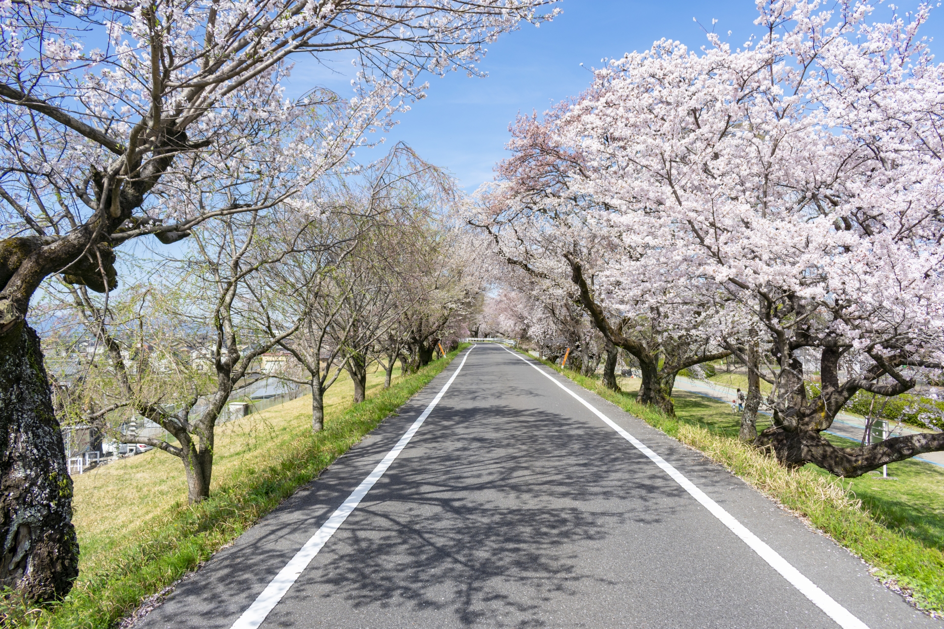 約4kmにわたって続く木曽川沿いの桜並木は、毎年春に多くの花見客で賑わいます。