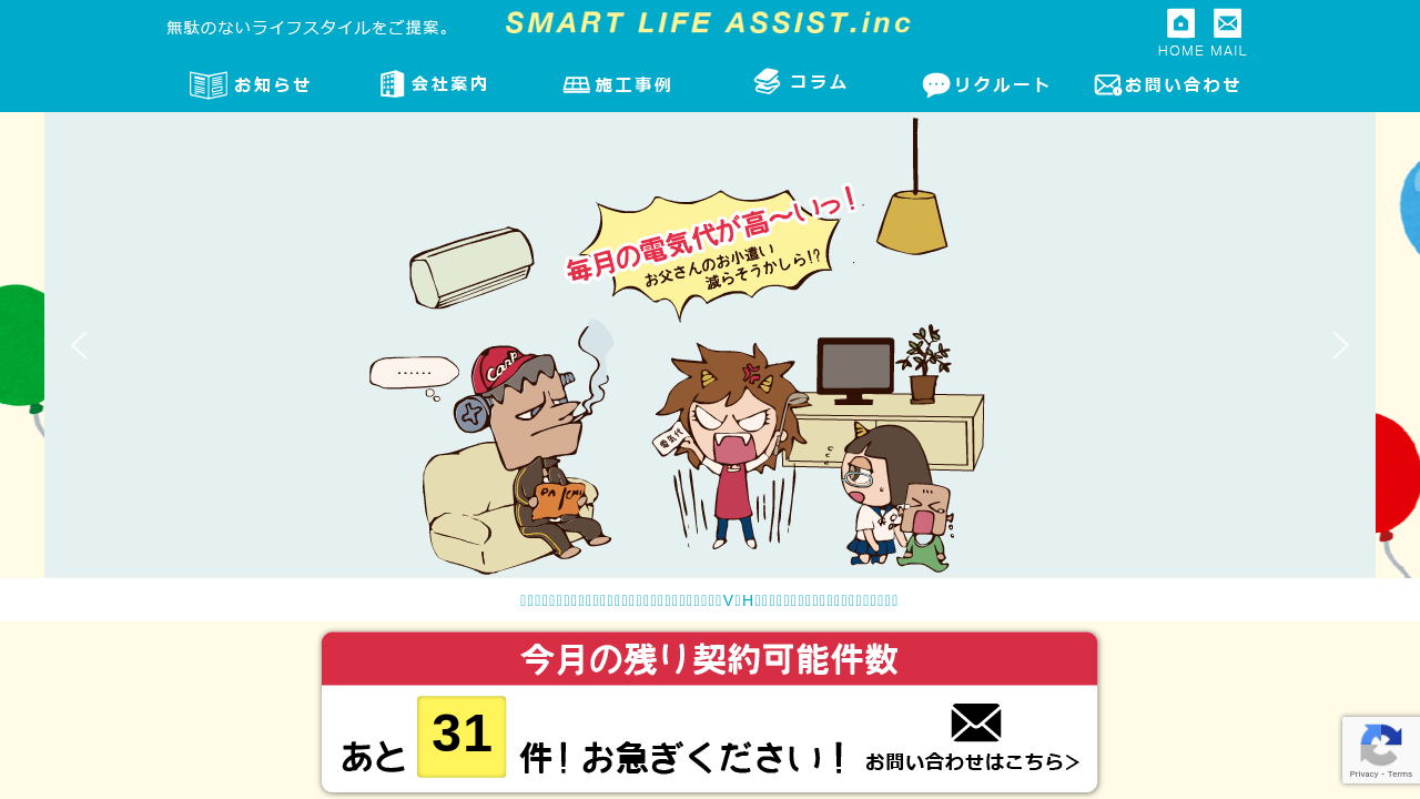 スマートライフアシスト株式会社スマートライフアシスト株式会社は、広島・山口・愛媛の地域密着型企業として、太陽光発電や蓄電池、エコキュート、V2Hといったサービスを通して、お客様の暮らしをより豊かに、そして快適にすることを目指しています。