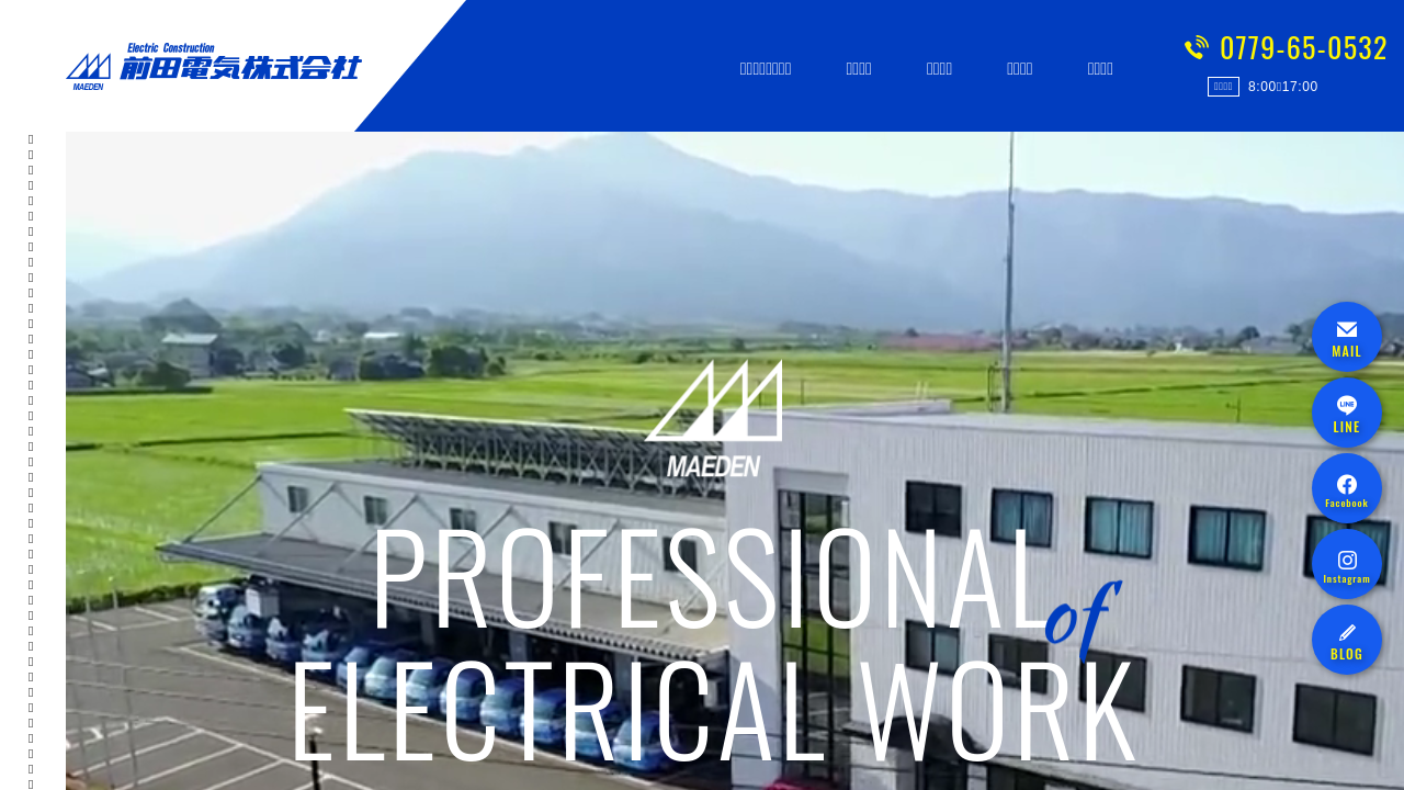 前田電気株式会社前田電気株式会社は、創業以来、北陸電力の配電線工事を始め、あらゆる建築物と機械設備等の電気工事を技術の向上及び無事故・無災害を念頭にお客様の立場に立って施工しています。