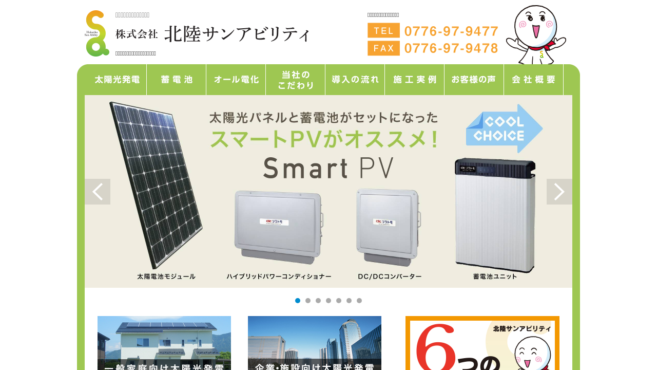 株式会社北陸サンアビリティ株式会社北陸サンアビリティは、福井県を拠点に太陽光発電や蓄電池の販売・施工・保守を行う会社です。