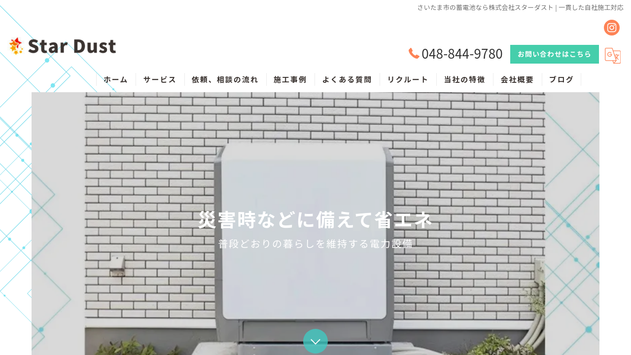 株式会社スターダスト株式会社スターダストは、埼玉県さいたま市を拠点に、蓄電池や太陽光発電などの省エネ設備の販売・施工を手掛ける会社です。