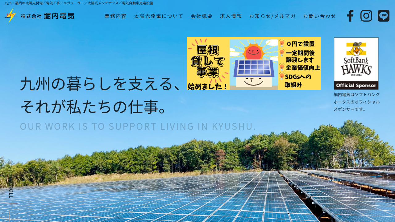 株式会社 堀内電気株式会社 堀内電気は、九州地域において、太陽光発電事業を展開するリーディングカンパニーです。創業から40年以上の実績を積み重ね、太陽光発電システムの設計・施工・メンテナンスまでを一貫して行っています。
