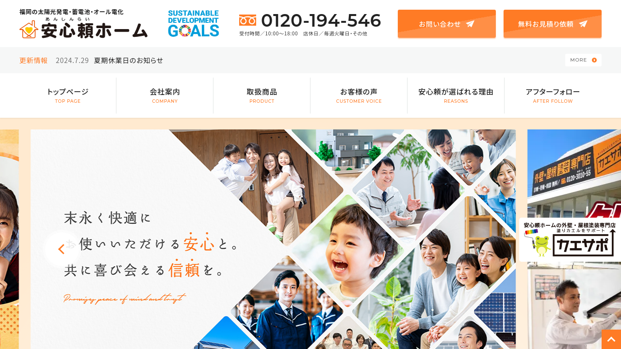 株式会社安心頼ホーム株式会社安心頼ホームは、福岡県を中心に九州圏内で太陽光発電・蓄電池・オール電化の販売・施工を行っている会社です。お客様の声を大切にし、丁寧な説明と充実したアフターフォローで、多くのお客様から信頼を得ています。