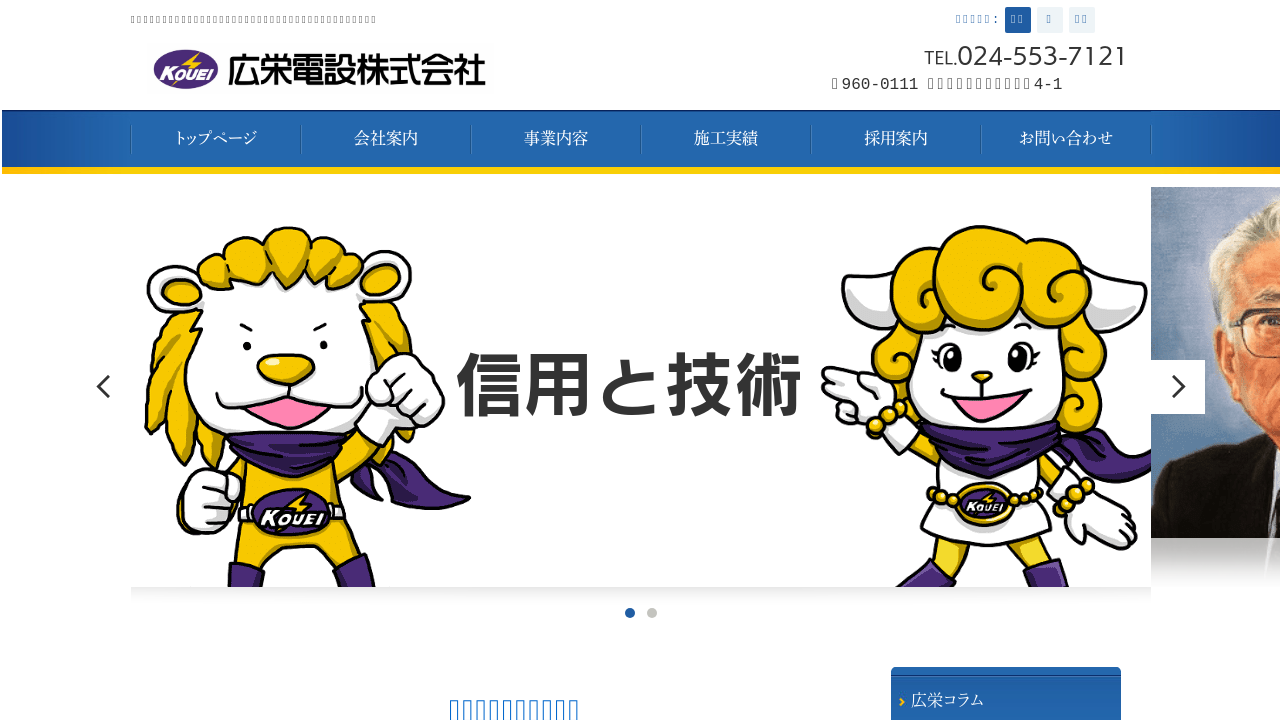 広栄電設株式会社福島県福島市に拠点を置く広栄電設株式会社は、地域社会への貢献を重視し、電気設備工事、太陽光発電事業、自動車リース事業など多岐にわたる事業を展開しています。創業から56年、培ってきた技術と信用を基に、お客様のニーズに合わせた高品質なサービスを提供しています。
