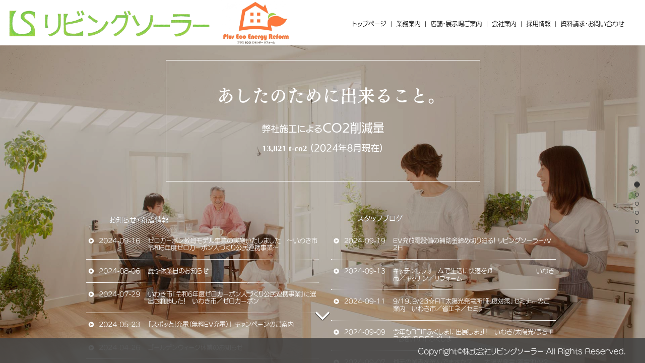 株式会社リビングソーラー株式会社リビングソーラーは、福島県いわき市に拠点を置く、太陽光発電システムの販売・施工からリフォームまでを手掛ける会社です。