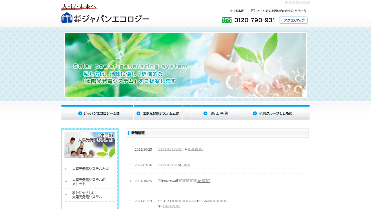 株式会社ジャパンエコロジー株式会社ジャパンエコロジーは、太陽光発電システムの販売・施工を専門とする会社です。