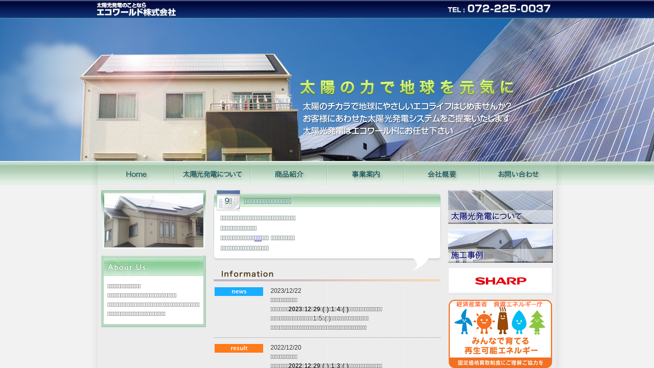 エコワールド株式会社エコワールド株式会社は、大阪・兵庫・奈良エリアに特化した太陽光発電システムの販売・施工会社です。