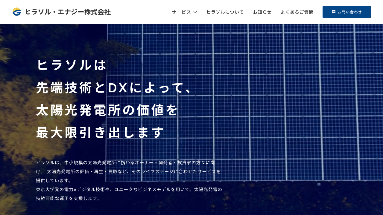 ヒラソル・エナジー株式会社ヒラソル・エナジー株式会社は、太陽光発電所の性能評価・再生・買取を専門とする会社です。