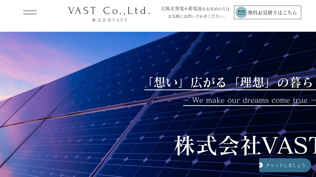 株式会社VAST株式会社VASTは、東京都武蔵村山市に拠点を置く、太陽光発電や蓄電池などの企画提案から工事、アフターフォローまでを一貫して行う施工専門店です。