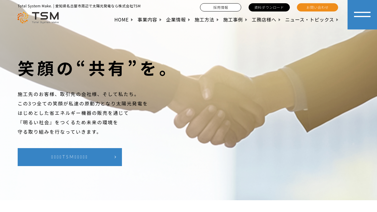 株式会社TSM株式会社TSMは、愛知県名古屋市周辺で太陽光発電システムの販売・施工を手がける会社です。
