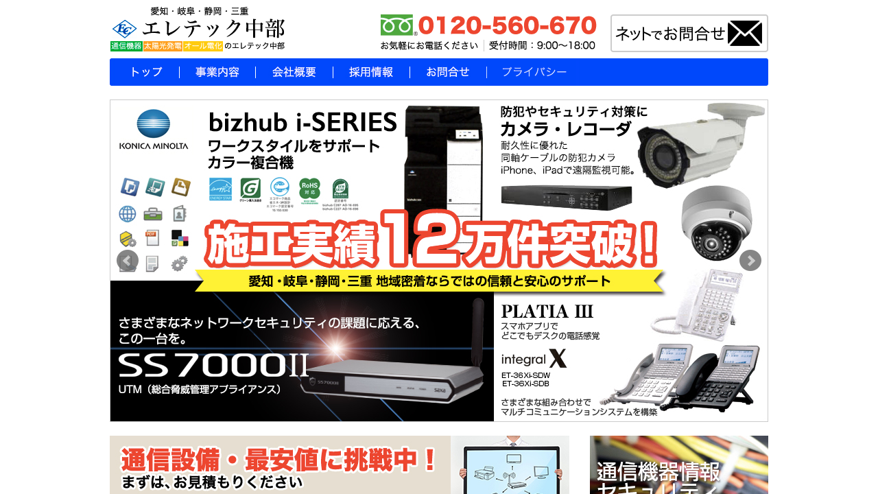 株式会社エレテック中部株式会社エレテック中部は、愛知・岐阜・静岡・三重の地域密着型企業として、通信機器・情報セキュリティ事業、オール電化・太陽光発電の導入、外壁塗装・リフォーム、オフィス用品販売代理など、多岐にわたる事業を展開しています。