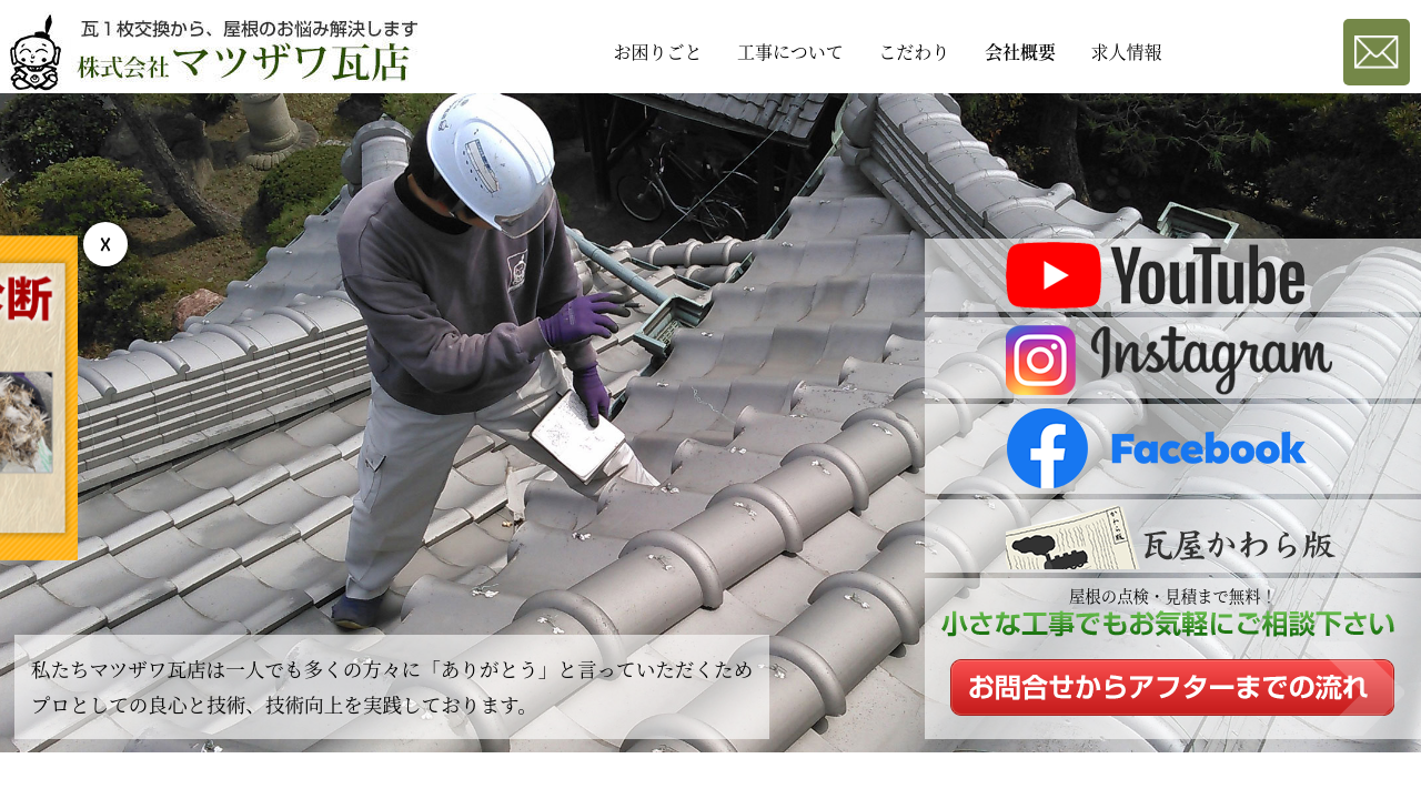 株式会社マツザワ瓦店株式会社マツザワ瓦店は、名古屋市中川区に拠点を置く、地域密着型の瓦専門店です。