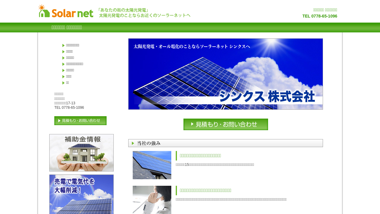 ソーラーネット シンクス株式会社ソーラーネット シンクス株式会社は、太陽光発電の販売・施工からアフターサービスまでを一貫して行う、福井県鯖江市に拠点を置く会社です。