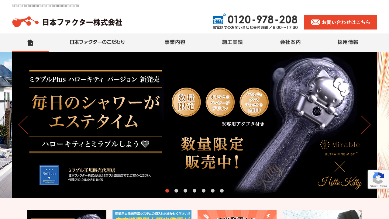 日本ファクター株式会社日本ファクター株式会社は、埼玉県越谷市を拠点に、太陽光発電・オール電化・スマートハウスの施工販売を手がける会社です。