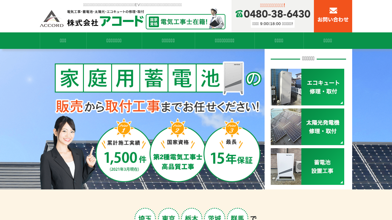 株式会社アコード株式会社アコードは、埼玉県を中心に電気工事、蓄電池・太陽光・エコキュートの修理・販売、リフォームを手がける会社です。創業9年で1,500件の実績を誇り、地域密着型の信頼できる企業として知られています。