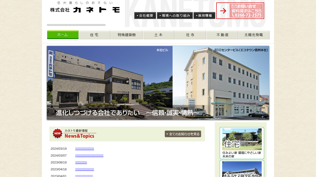 株式会社カネトモ株式会社カネトモは、長野県茅野市に拠点を置く総合建設会社です。昭和23年の創業以来、65年以上にわたり、諏訪地域を基盤に、住宅・リフォーム、特殊建築物、土木、社寺、不動産、太陽光発電システムと幅広い事業を展開しています。