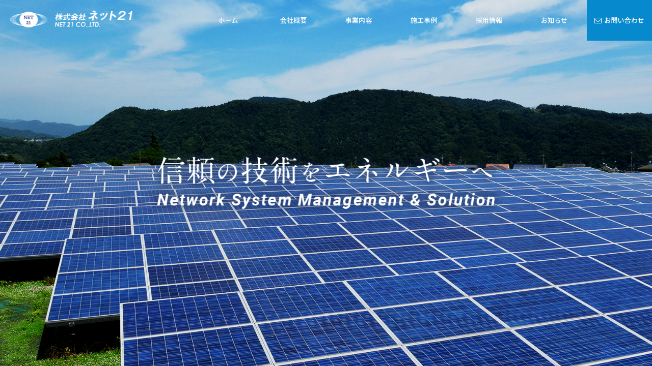 株式会社ネット21は、東京都を拠点とする、電気工事・太陽光発電施工のプロフェッショナル集団です。