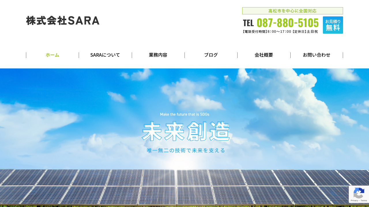株式会社SARA(サラ)株式会社SARA(サラ)は、高松市を中心に全国で太陽光発電工事を専門に行っている会社です。