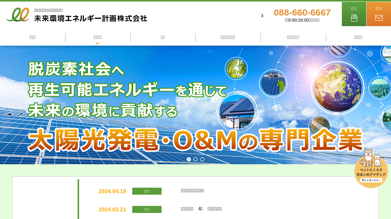 未来環境エネルギー計画株式会社未来環境エネルギー計画株式会社は、徳島県・四国地方に根差した太陽光発電の専門企業です。