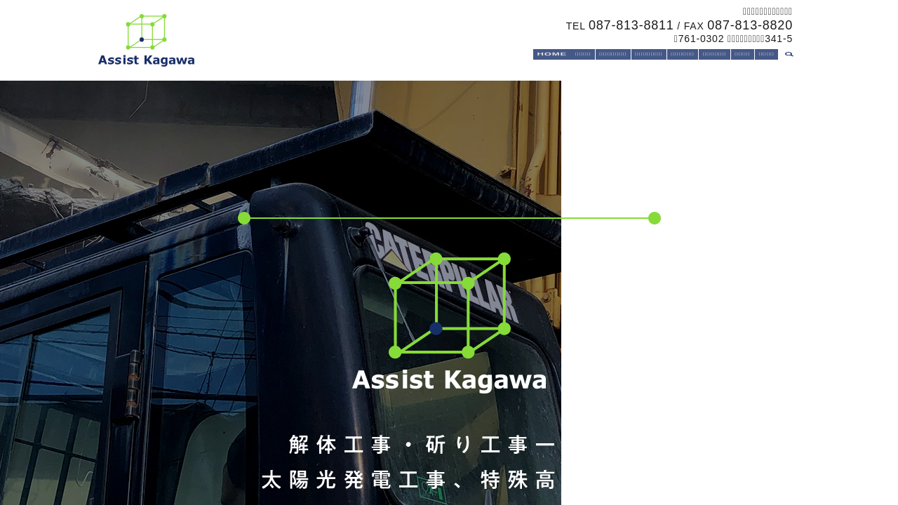 株式会社アシスト香川株式会社アシスト香川は、香川県高松市に拠点を置く、解体・斫り工事、太陽光発電工事、特殊高圧洗浄を専門とする施工会社です。