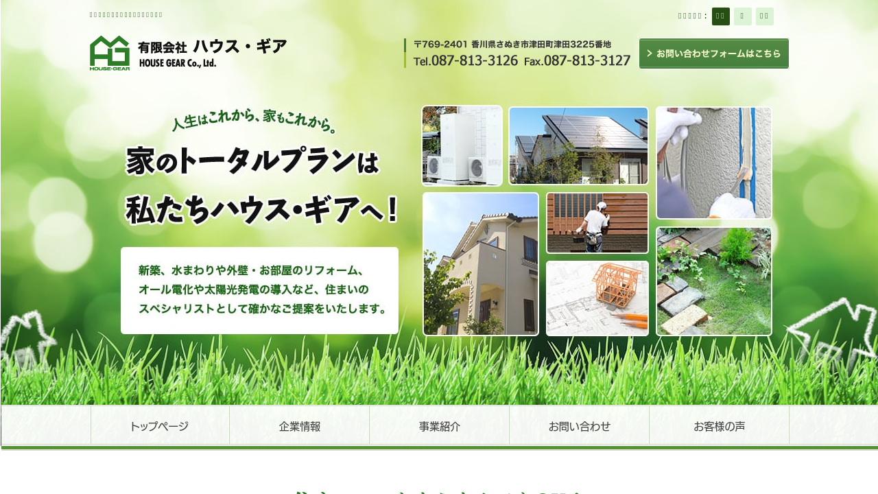 有限会社ハウス・ギアは、香川県さぬき市津田町に拠点を置く、地域密着型の会社です。新築・リフォームから、オール電化・太陽光発電まで、住まいのトータルサポートを請け負っています。