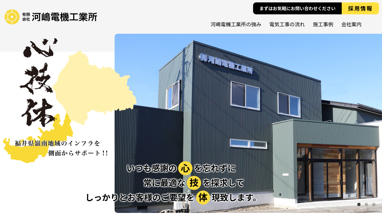 有限会社河嶋電機工業所有限会社河嶋電機工業所は、福井県小浜市を拠点とし、電気設備・空調設備・太陽光発電・防犯カメラ設置など幅広い事業を展開する会社です。