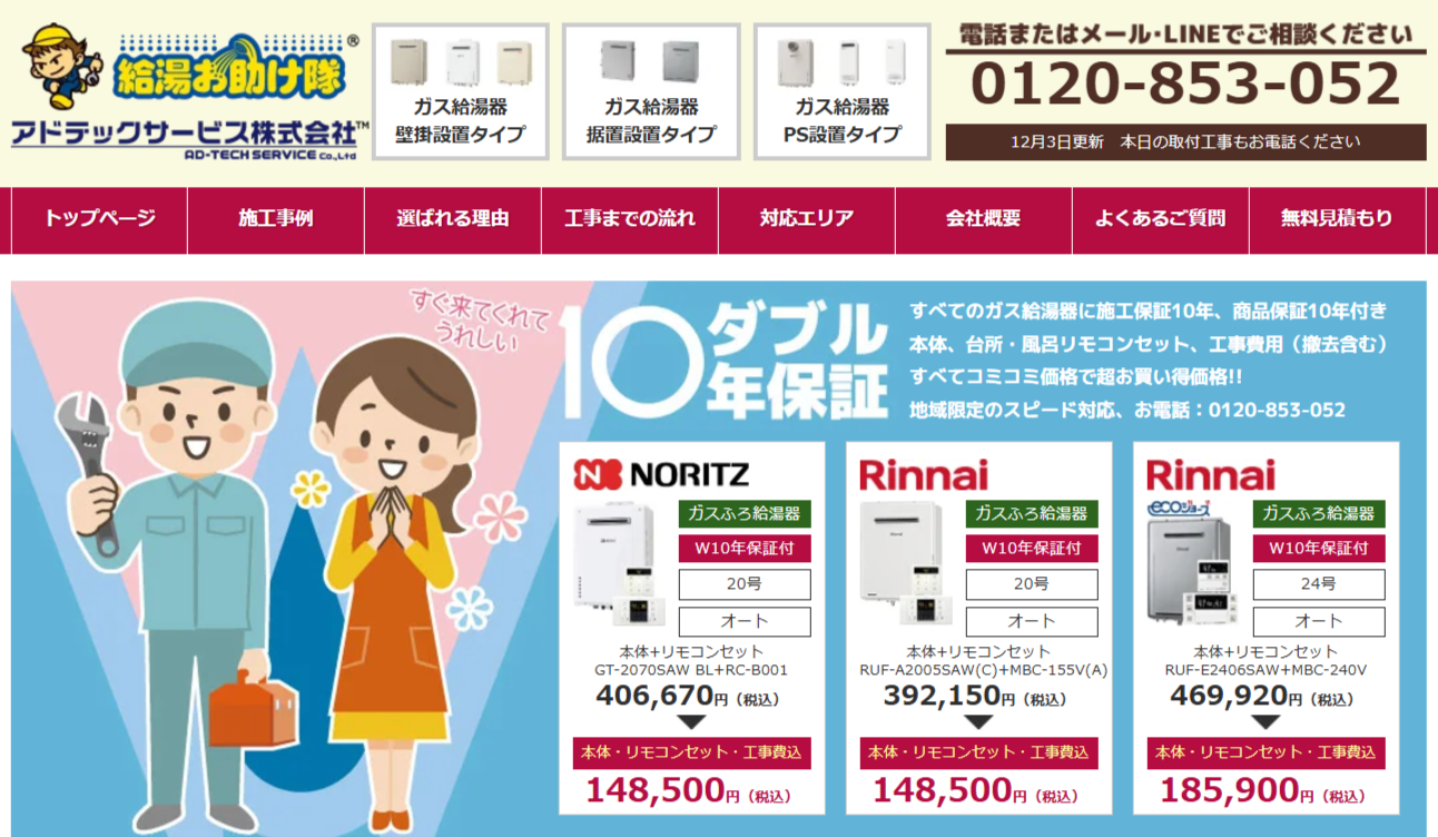 街角給湯相談所はメーカーと直接契約し、大量に仕入れているため、給湯器本体の価格が抑えられています。最大92%割引で、さらに10年保証も付いています。ガス給湯器やエコキュートなど、さまざまなメーカーの機器を取り扱っています。
