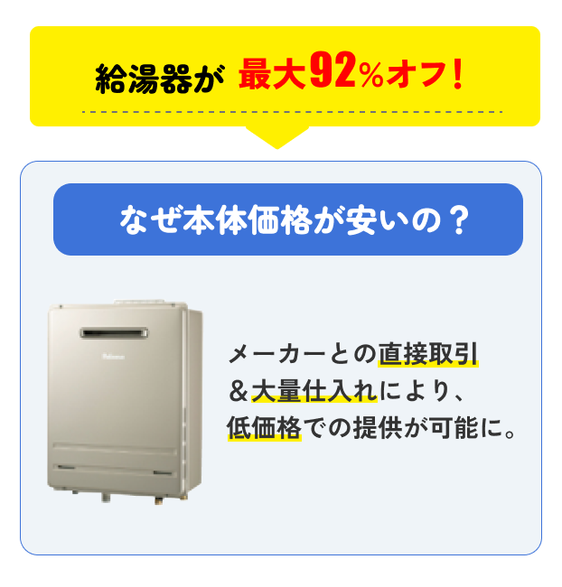 給湯器専門業者とは給湯器の販売や交換工事を専門的に行っている事業者のことです。メーカーから直接仕入れをしているため中間業者を介しておらず、その分値段を下げることができています。