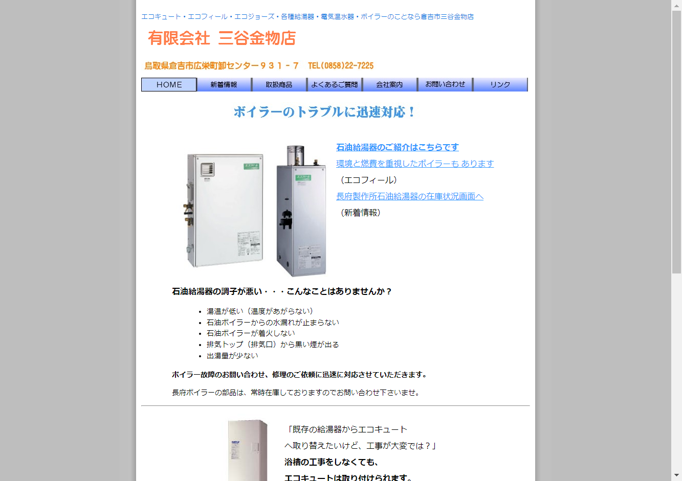 有限会社三谷金物店は、エコキュートやエコフィール、エコジョーズなどの各種給湯器、電気温水器、ボイラーの販売を行っています。また、石油給湯器の修理、取替えサービスも提供しており、給湯器に関するあらゆるニーズに対応しています。