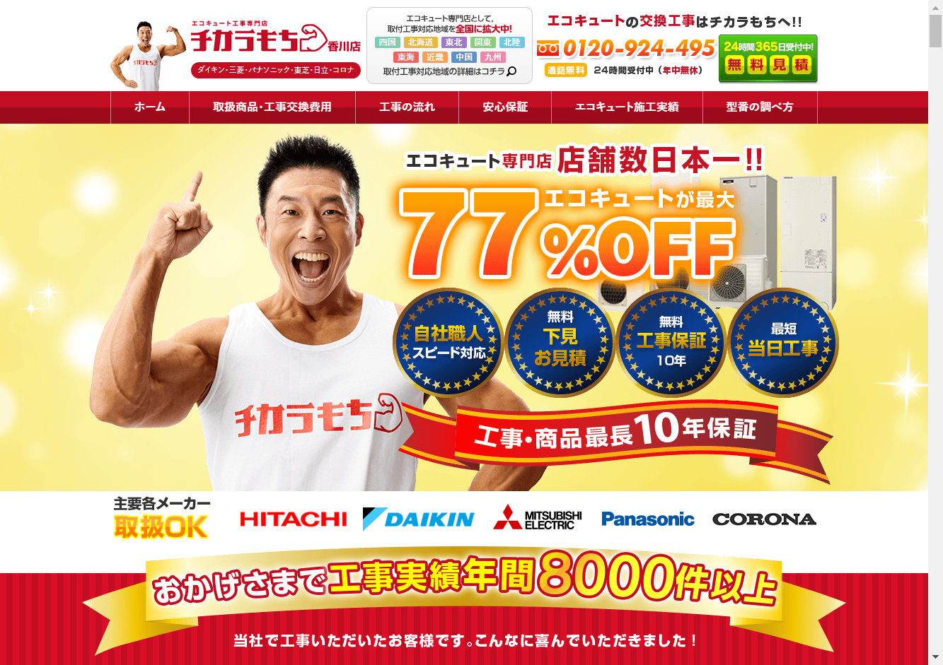 チカラもち香川店チカラもちは、全国50か所以上という広範囲に拠点をかまえ、給湯器・エコキュートの交換、修理をおこなっている専門業者。