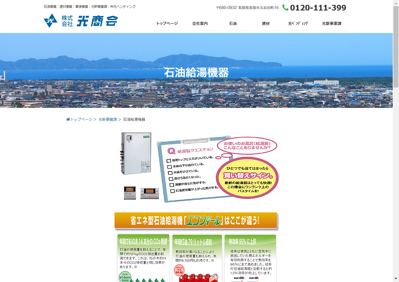 鳥取県中部の倉吉市を拠点に活動している私たちの会社は、長府製作所の販売実績NO.1代理店として、エコキュートやエコフィール、エコジョーズなどの各種給湯器、電気温水器、ボイラーの販売を行っています。