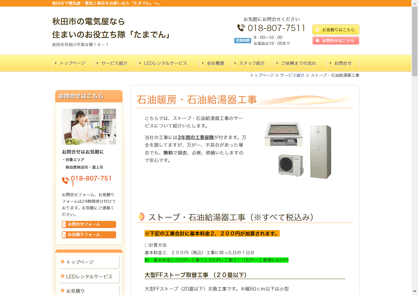 株式会社タマディスカバリー笑顔・親切・丁寧な対応で顧客からの信頼を得ている会社です。ストーブ・石油給湯器工事、LEDレンタルサービス、エアコン工事、アンテナ工事、コンセント・スイッチ工事、照明工事等、幅広いサービスを提供しています。