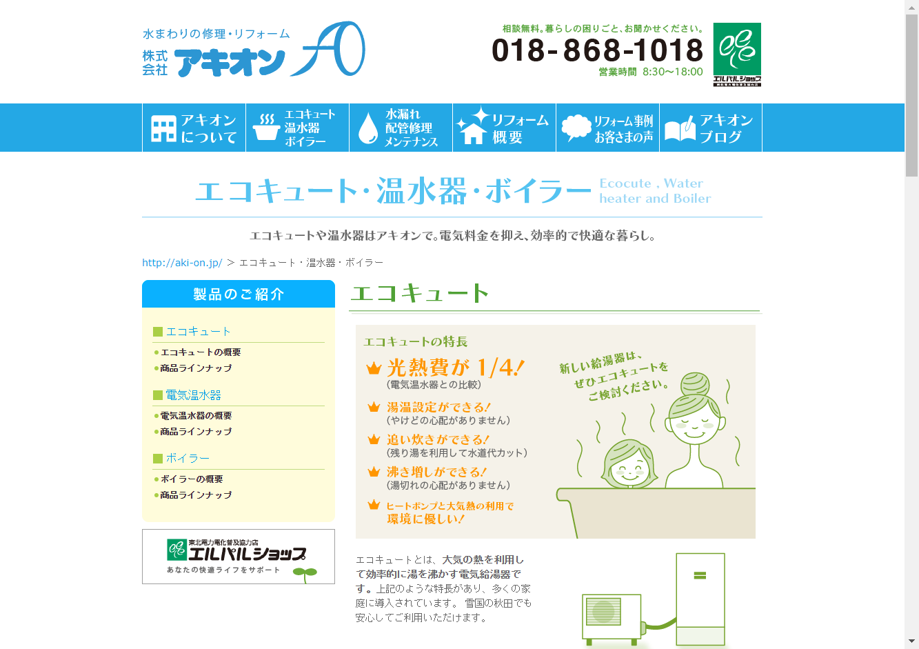 株式会社アキオン当社は、秋田市外旭川八柳に拠点を構え、地元密着型のサービスを行っています。豊富な商品ラインナップと、それぞれの商品特性に基づいた効率的な提案が可能な業者です。主なサービスは、エコキュート・温水器・ボイラーの設置・リフォーム、水漏れ・配管工事・メンテナンスです。特に、電気温水器からエコキュートに買い替えると10年間で約404,000円の節約が可能であることを示しており、ランニングコストの節約にも貢献します。地域に根ざした対応が可能であり、顧客の細かな要望にも柔軟に対応できます。