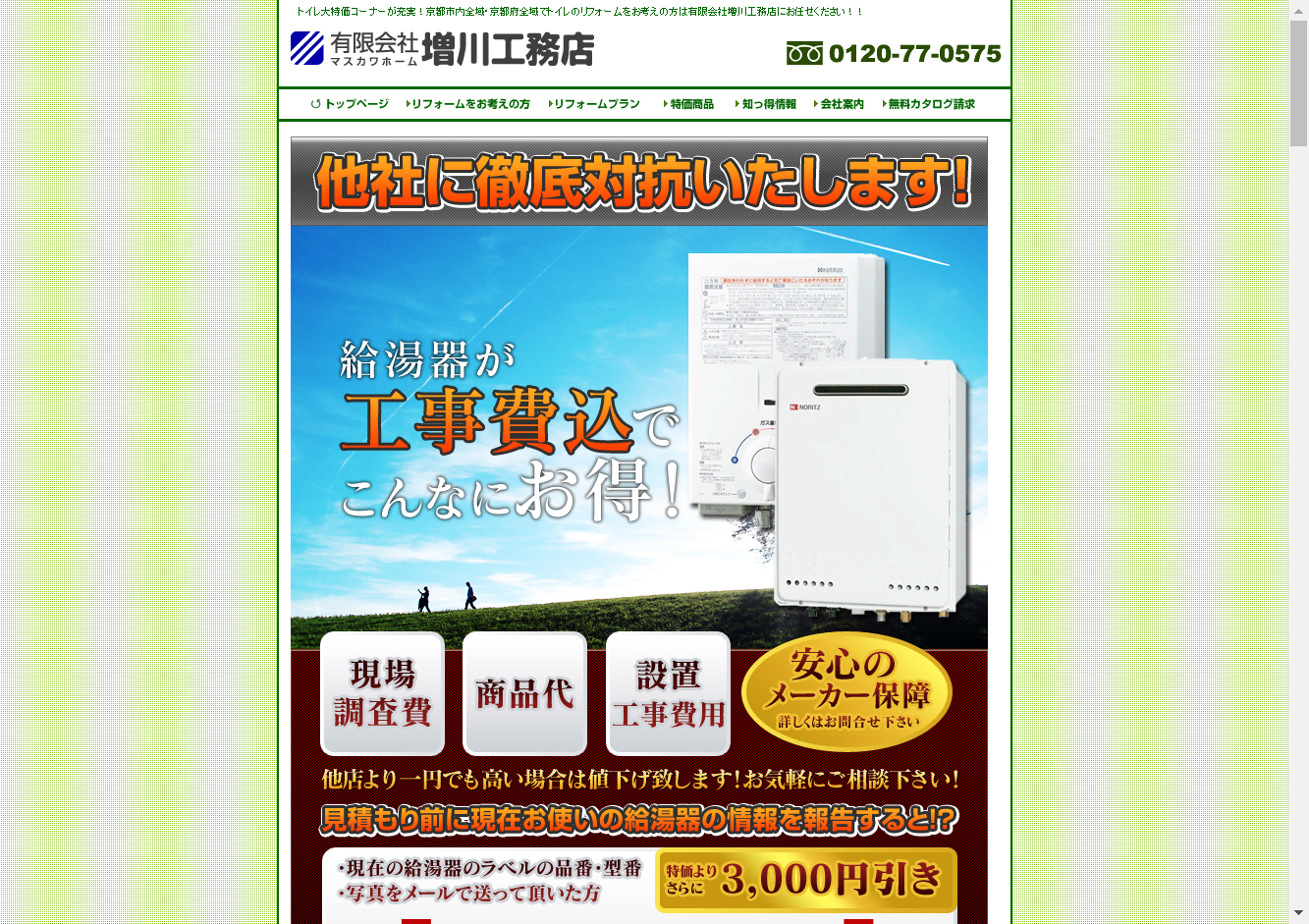 有限会社増川工務店京都市を拠点に、給湯器の販売と取り付け、既存給湯器の脱着と廃棄、トイレのリフォーム、各種設備工事などを手掛けている企業です。京都市内全域・京都府全域に対応し、価格と品質でホームセンターに負けないサービスを提供しています。60年以上の実績と信頼をもとに、特別価格で商品を提供。価格には現場調査費、設備工事費、脱着工事費、既存廃棄費が含まれ、新品保証5年付きなので、安心して利用できます。
