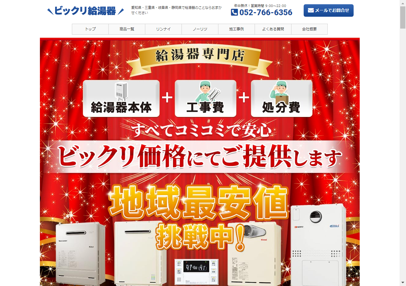 ビックリ給湯器弊社は{名古屋市中区を拠点に、愛知県、三重県、岐阜県、静岡県に対応する給湯器の交換・設置専門のサービスを提供しています}。全員がガス有資格者であるため、給湯器のトラブルにも安心して対応できます。また、{10年間の無料工事保証}や{工事費込みの価格設定}、{追加料金が発生しない点}など、利用者の安心を最優先に考えています。商品は都度仕入れることで新古品や型落ち品を提供しないので、いつでも最新の品を提供します。営業時間は年中無休の9:00~22:00で、給湯器のトラブルに迅速に対応します。