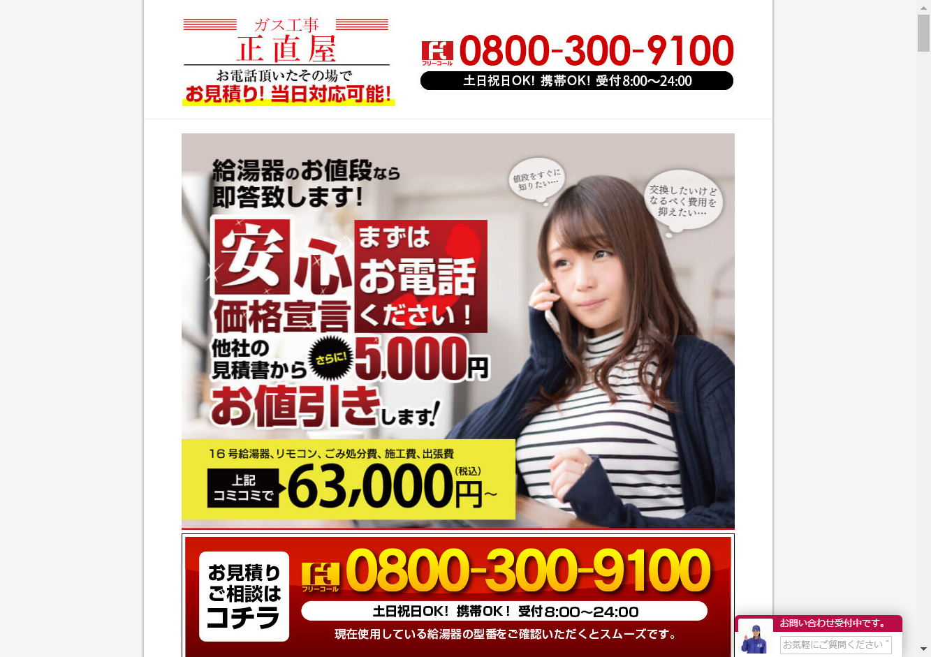 正直屋(ジャパンネクストリテイリング株式会社)【愛知県名古屋市千種区】を拠点に全国展開を行っている給湯器交換専門の業者です。高品質ながらも激安価格で給湯器の交換を行い、その実績は毎月数千件に上ります。