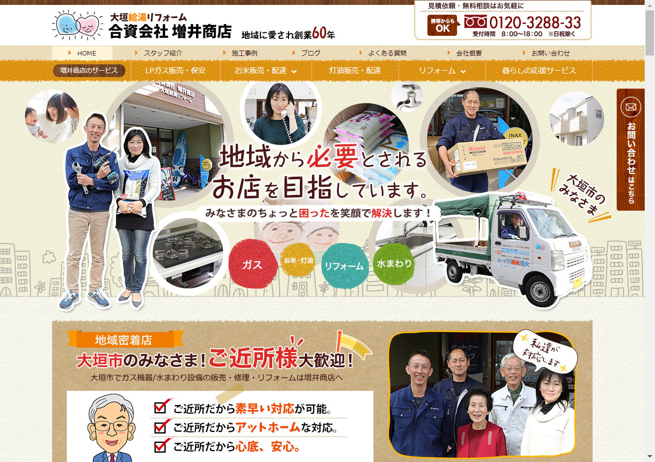 岐阜県大垣市を中心に、池田町、揖斐川町、大野町、神戸町、瑞穂市、垂井町、養老町、安八町、北方町、本巣市、岐阜市近辺で幅広いサービスを提供しています。LPガス販売・供給・保安業務からお米や灯油の販売と配達、介護リフォームや給湯器、蛇口、トイレの交換工事まで、お客様の生活を支える様々なサービスを一手に担っています。電話一本で迅速に対応し、特にお得意様には素早いサービスを提供しています。
