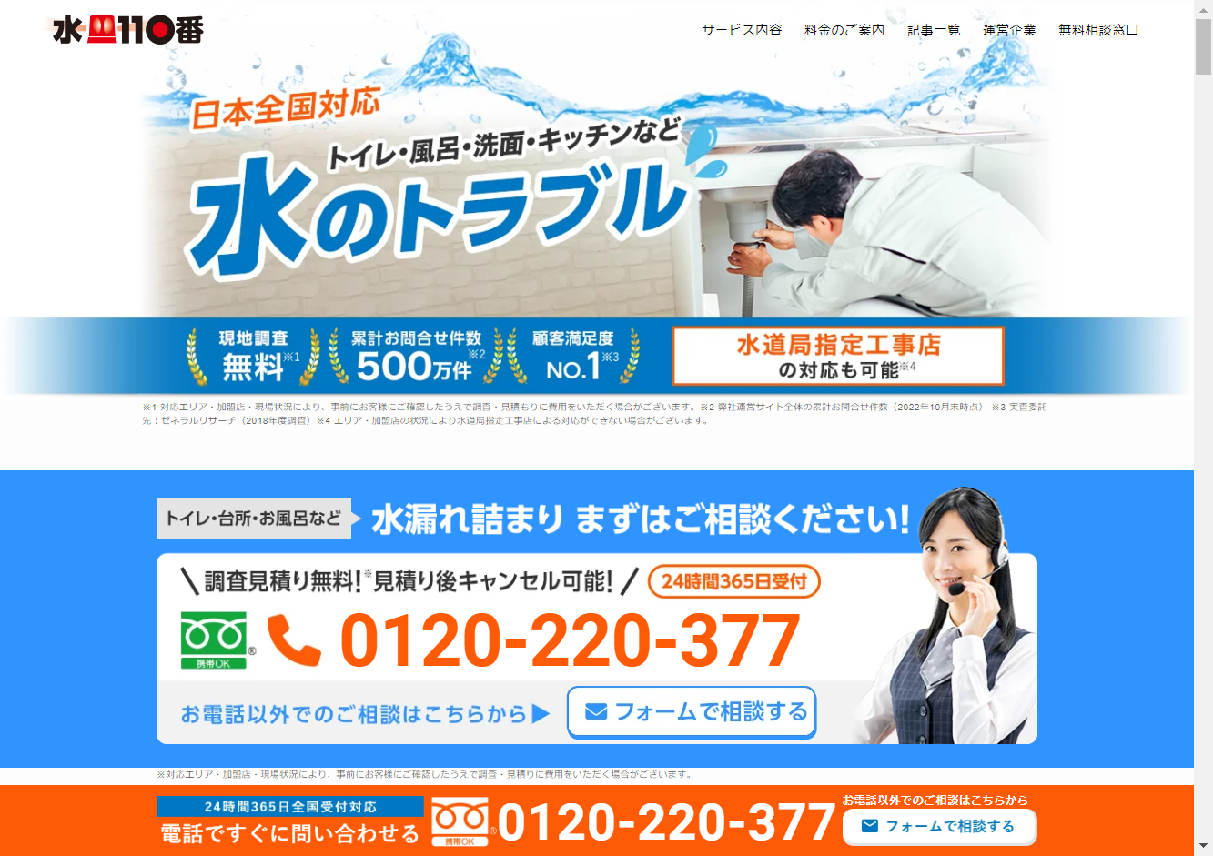 24時間365日の対応体制と、累計問合せ件数500万件以上という実績を持つ信頼性が強みとなっています。お見積もり後の追加料金は一切なく、無料の現地調査も行います。