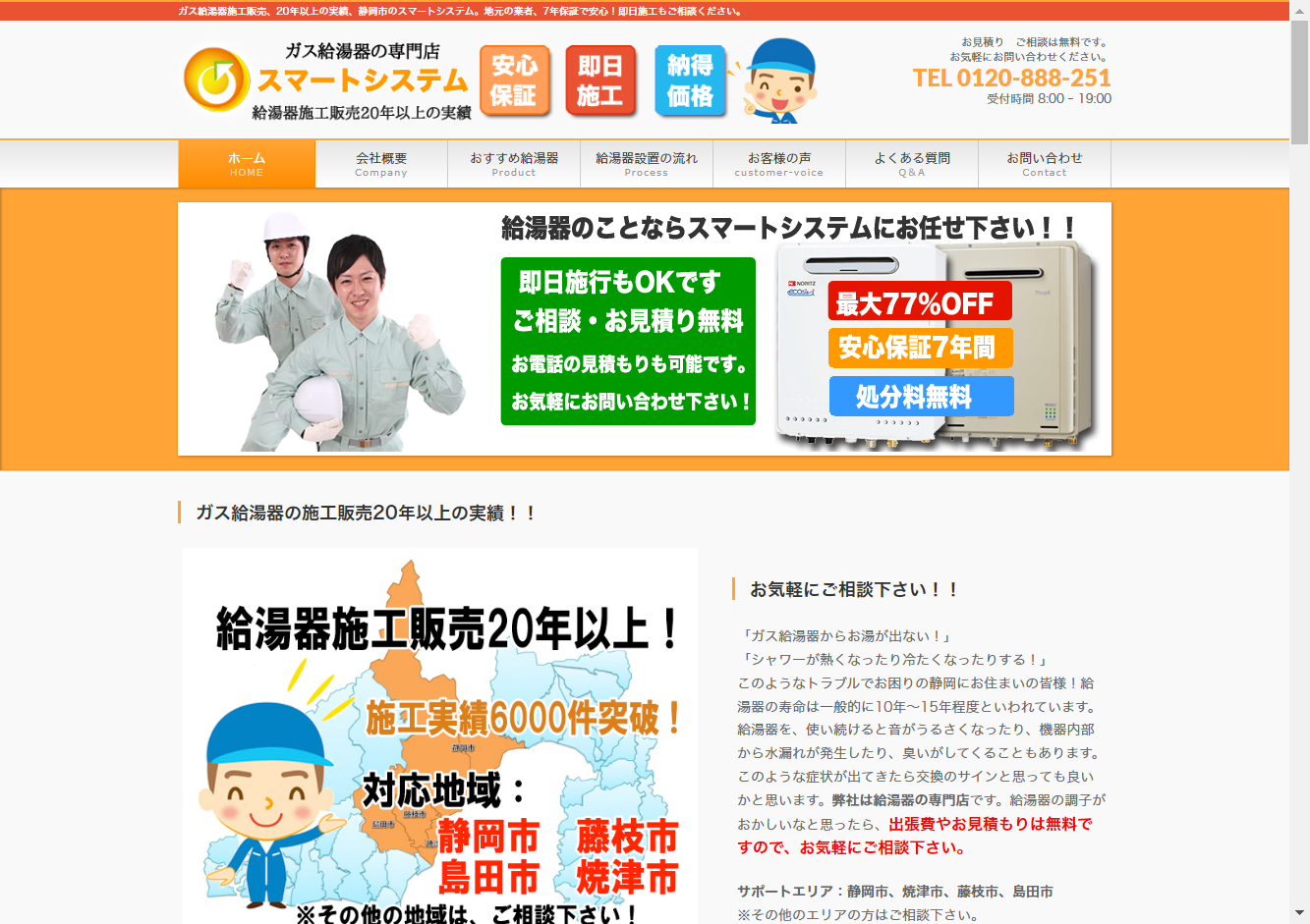 スマートシステムスマートシステムは、静岡市駿河区向敷地に事業所を構える20年以上の経験を持つガス給湯器の専門業者です。対応エリアは静岡市、藤枝市、島田市、焼津市を中心に、その他のエリアについても相談に応じます。スマートシステムの強みは、即日施工が可能であり、見積りや出張費も無料です。また、メーカーから直接仕入れることでお手頃な価格で提供することができます。さらに、専門のスタッフによる安全な施工と7年間の保証も提供しています。迅速かつ丁寧な対応を心がけており、お客様のニーズに確かな技術とサービスでお応えします。