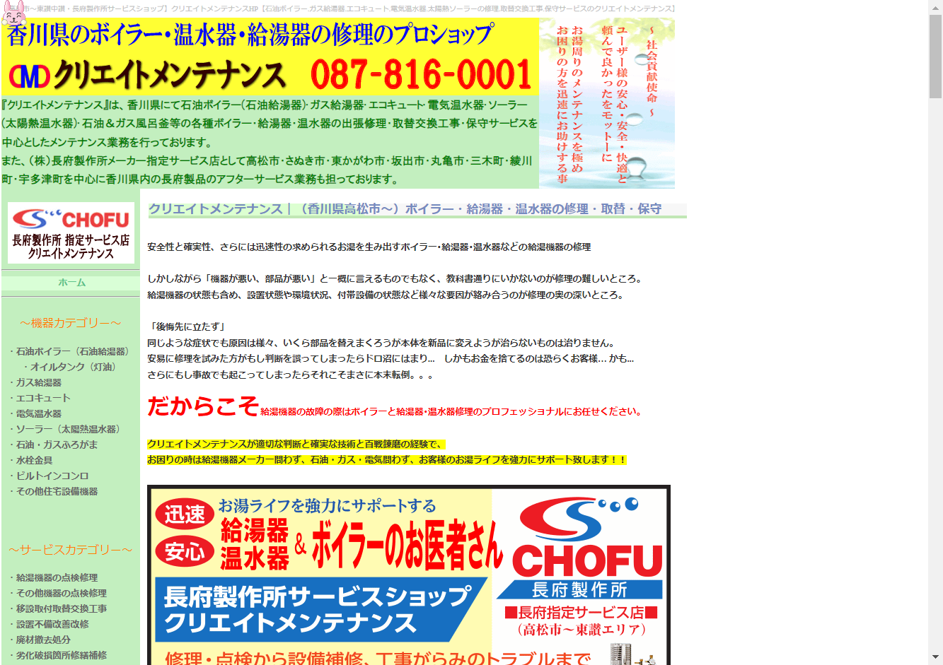 長府製作所サービスショップ クリエイトメンテナンス香川県木田郡三木町を拠点に、主に高松市・さぬき市・東かがわ市・坂出市・丸亀市・三木町・綾川町・宇多津町を対応エリアとしています。