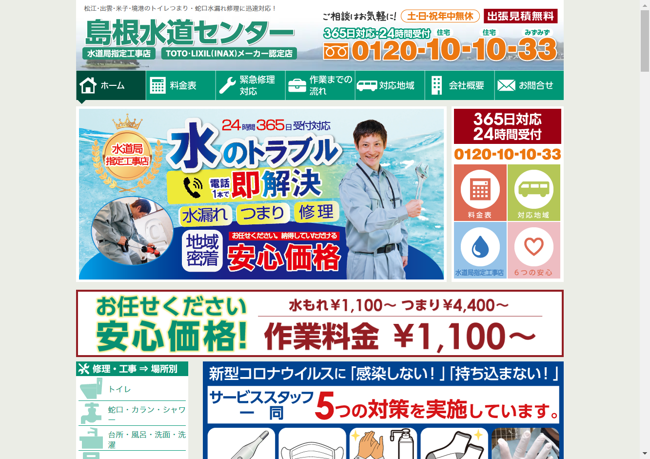 島根水道センター松江市を拠点に島根県・鳥取県の各市・町で活動する信頼の業者です。水洗トイレ、蛇口、シャワー、洗面台、キッチンなどの修理から、下水・排水溝つまり修理、配管設備工事、排水管清掃・高圧洗浄、漏水調査・つまり検査、上下水道工事まで幅広く対応します。新品交換やエコキュートの交換も可能です。24時間受付、365日対応で、便利な後払いサービスや作業前見積りサービスもご利用いただけます。島根県・鳥取県の各市・町で指定給水装置工事事業者の認可を受けており、水道局指定工事店として信頼と実績を持っています。TOTOリモデルクラブ、LIXIL(INAX)リフォームの認定店であり、旧製品から新製品まで対応可能です。作業保険に加入し、最大5年の無料保証を提供しているので、安心してご利用いただけます。緊急対応地域は島根県と鳥取県の特定の市・町です。