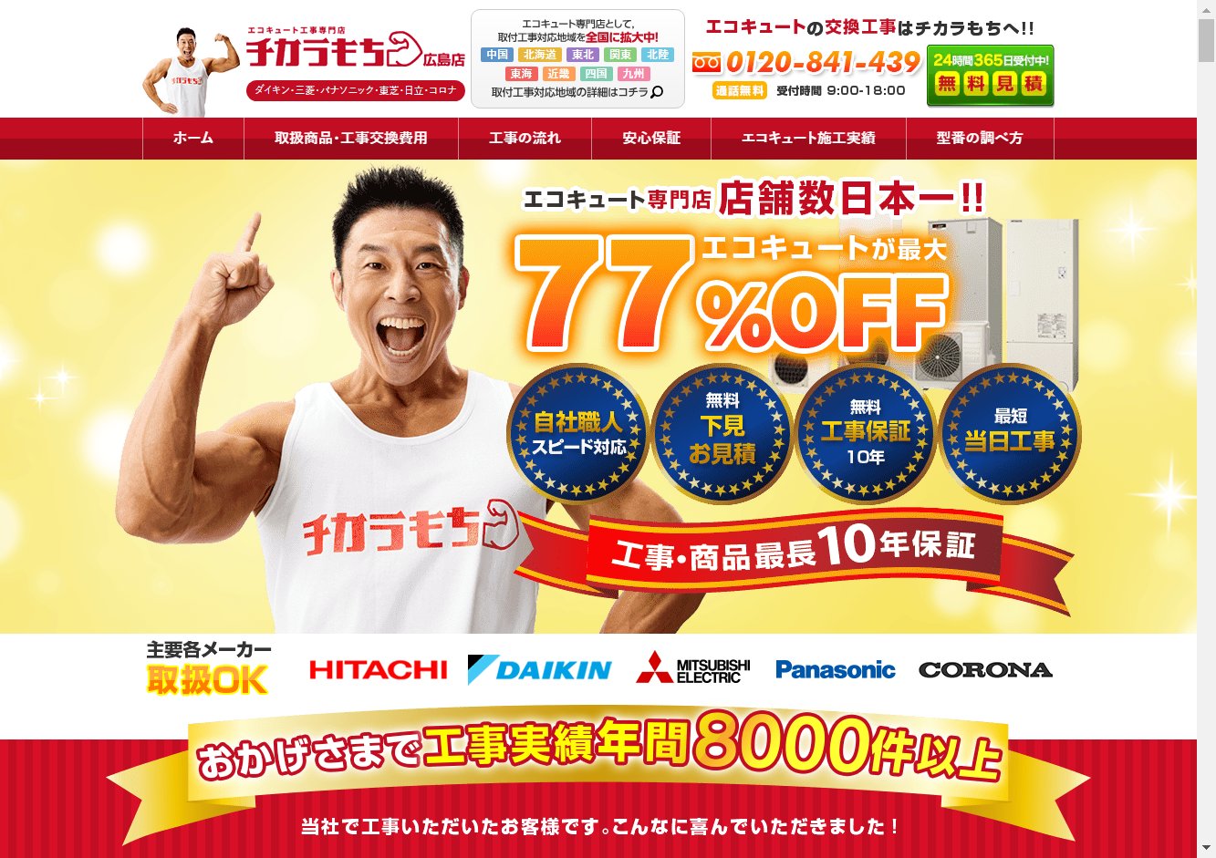 倉興株式会社(チカラもち山口店)チカラもちは、全国50か所以上という広範囲に拠点をかまえ、給湯器・エコキュートの交換、修理をおこなっている専門業者。
