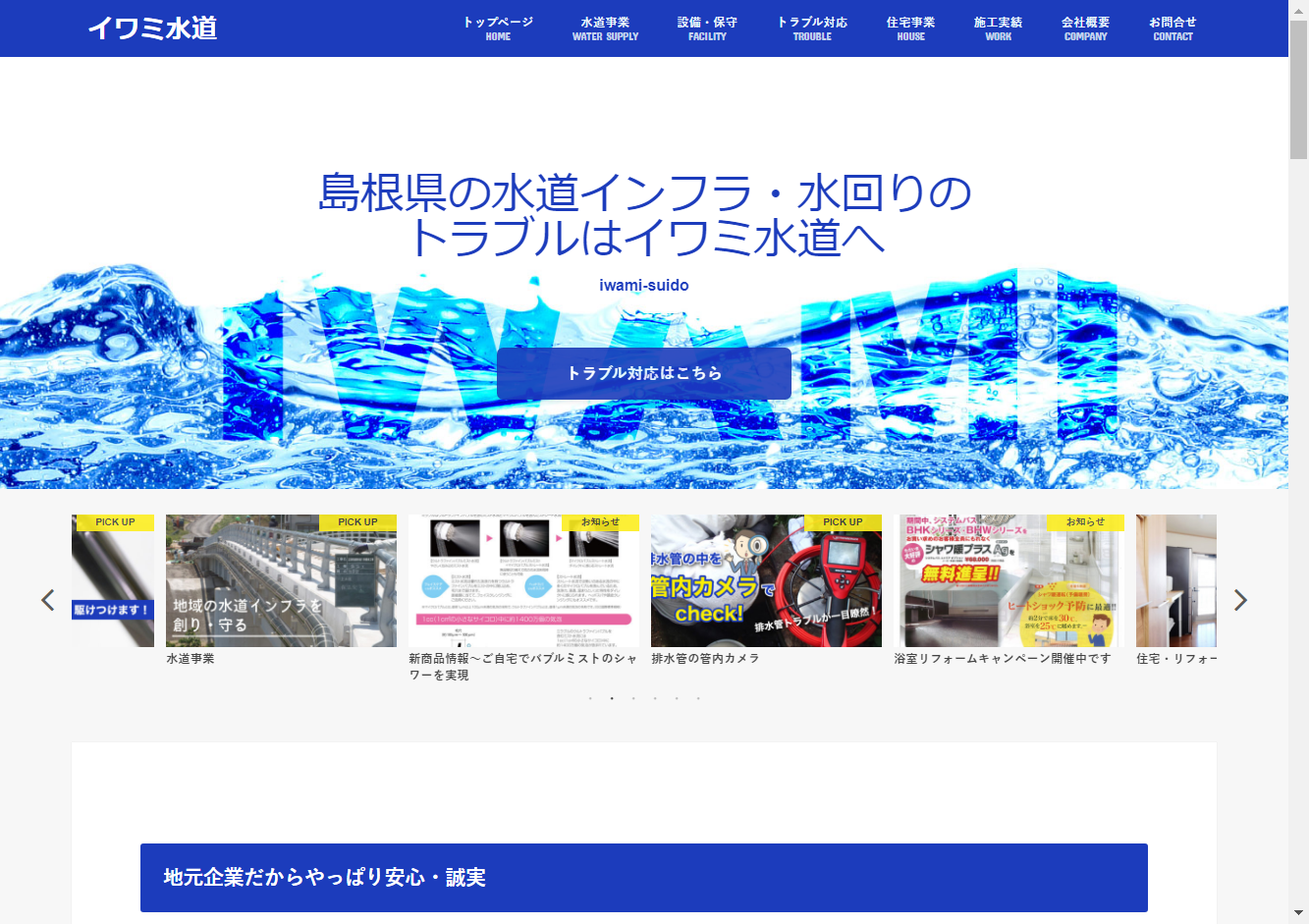 イワミ水道有限会社 本社イワミ水道有限会社は、島根県江津市桜江町に本社を置く地元企業です。地域の水道インフラを作り・支えつづけてきた実績が信頼の源泉であり、幅広いサービスを提供しています。水漏れやつまり、凍結などのトラブル対応やキッチン・トイレ・風呂のリフォーム、施設の排水や空調設備の施工・保守などに対応しています。また、浄化槽・食洗機の販売・設置、畑やガーデニングの散水設備、井戸掘り、井戸ポンプ汲み取り、トイレの無臭化、排水管内のトラブルチェックなども行っています。地元企業ならではの安心感と誠実さ、お見積もり無料、トラブル対応の迅速さが顧客へのサービス提供メリットとなっています。