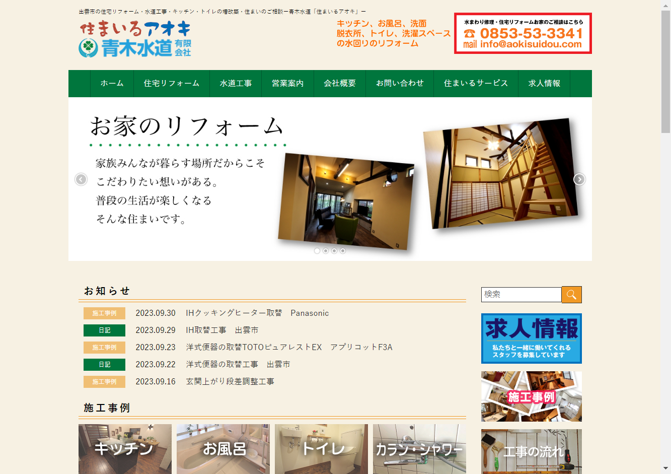 青木水道有限会社弊社は、島根県出雲市を中心に、住宅リフォームや改築、水道工事、窓のリフォーム、エコ給湯取替工事、各種給湯器の取替え、漏水修理といった幅広いサービスを提供する水道業者です。大社町、湖陵町、佐田町、斐川町、多岐町、平田町といった周辺地域にも対応しております。