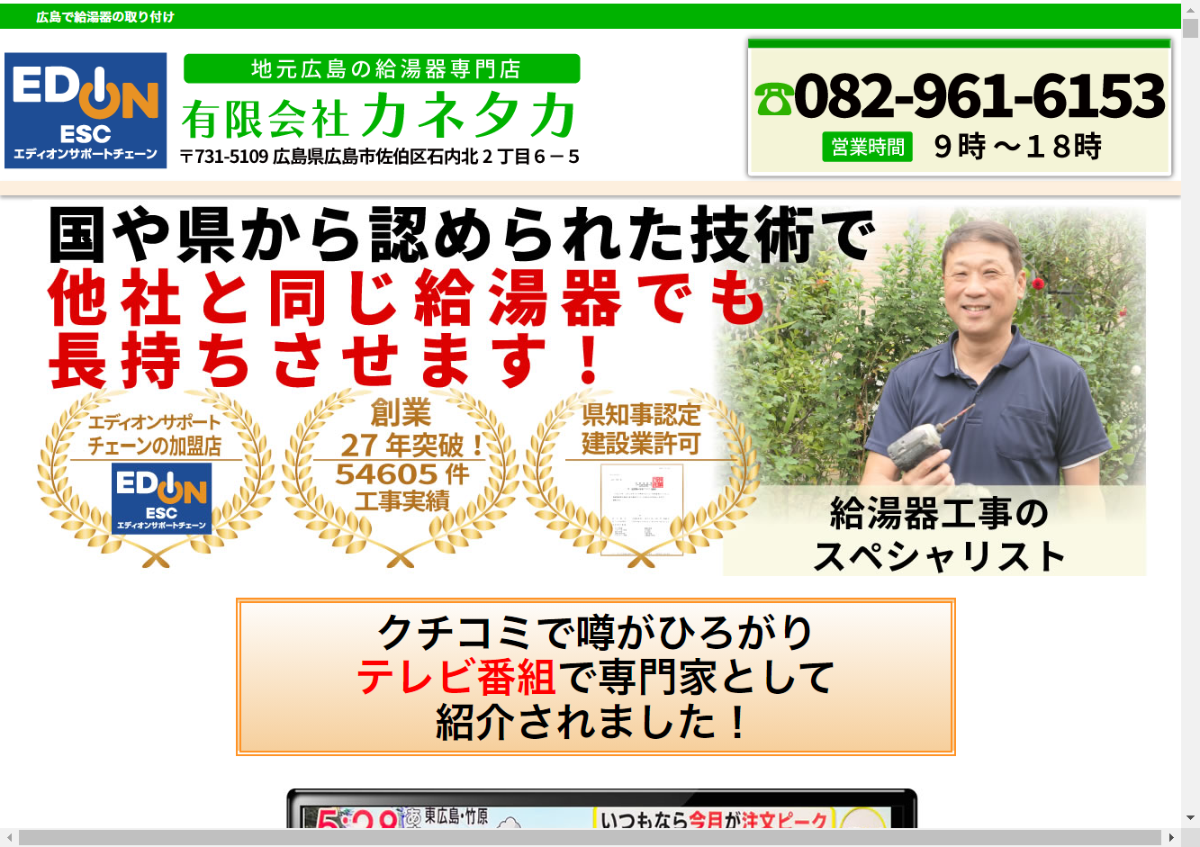 これまでに延べ5万件の工事を行い、ラジオ出演や広島経済レポートでの紹介などメディア露出もある信頼性の高い業者です。給湯器の寿命を長持ちさせるメンテナンス技術も提供しています。