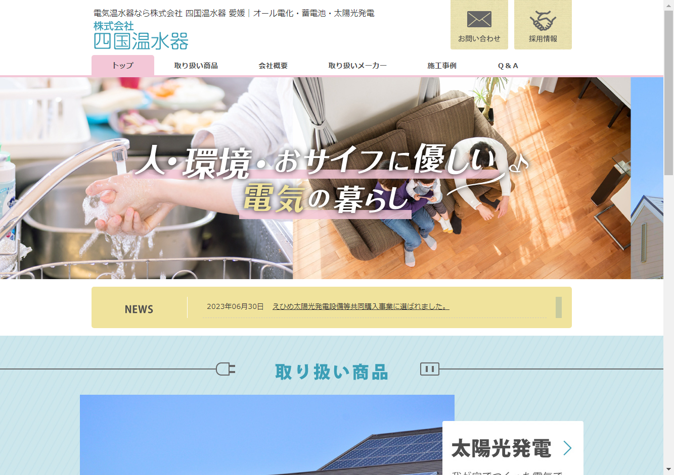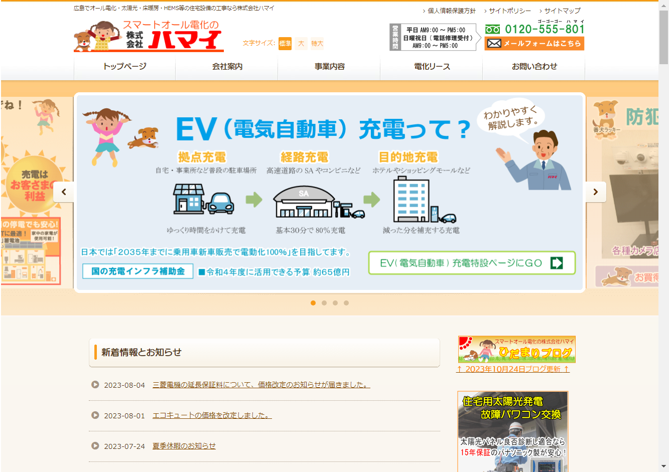 広島県南部(安芸郡、広島市、東広島市、呉市、廿日市市等)を対応エリアに、オール電化・床暖房・太陽光・HEMS等の住宅設備の工事からスマートオール電化、エコキュート、LEDリニューアル、太陽光発電、V2H、防犯カメラ、換気システム等の施工まで幅広く対応。