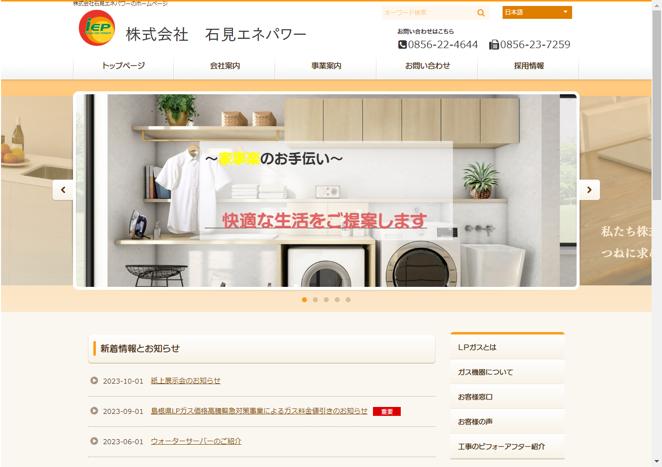 本社を島根県益田市に構え、その他2箇所の拠点を持つ当社は、ガス機器とエネルギー供給のプロフェッショナルです。生活を支えるガス機器、ガスコンロ、ガス給湯器、ガス衣類乾燥機の提供から、LPガスの供給、エネファーム(家庭用燃料電池)の提供、ウォーターサーバーの提供まで、幅広いサービスを行っています。