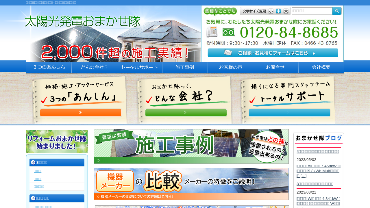 太陽光発電おまかせ隊(株式会社トレシス)太陽光発電おまかせ隊は、神奈川県藤沢市に拠点を置く、地域密着型の太陽光発電システムの販売・施工会社です。
