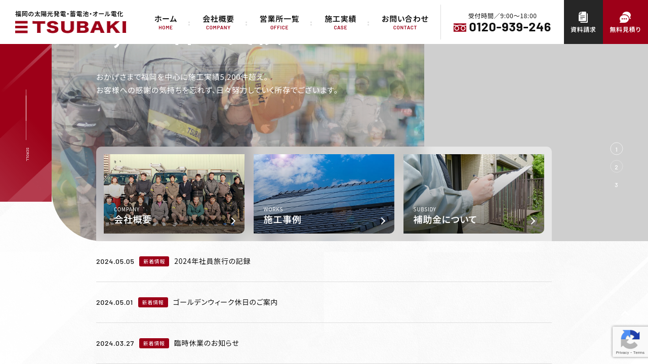 株式会社つばき電設 本社株式会社つばき電設 本社は、福岡県那珂川市に拠点を置く、太陽光発電や蓄電池などの省エネシステムの提案・施工を専門とする会社です。